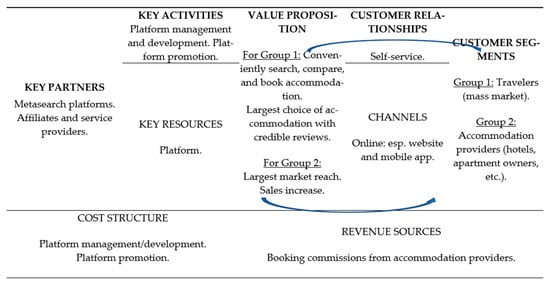 From a business model perspective, it should be noted that not all OTAs have the same digital business model. Indeed, important differences can be identified between “standard OTAs” that use a value chain business model and “two-sided OTAs”—also known as two-sided platforms or markets. Although these differences between the two groups will be discussed in more detail later with a case study of their best-known representatives, Expedia and Booking.com, they will be briefly explained here. In brief, a standard OTA rents capacity, such as hotel rooms, at wholesale prices and then sells it to end customers through digital channels [44] either independently or as a part of travel packages, much as traditional travel agencies did through traditional distribution channels. In terms of revenue sources, standard OTAs mostly use a “merchant model” where revenue is based on margin, but alternatively, they may use an “agency model” where revenue is based on commissions [43]. In contrast, two-sided platforms typically do not use the merchant model because two-sided platforms do not rent capacity but primarily match supply and demand in their digital market [41,45]. In current business practice, the two-sided platform model has proven to be superior, enabling its leading representatives to grow rapidly and gain a high market share.