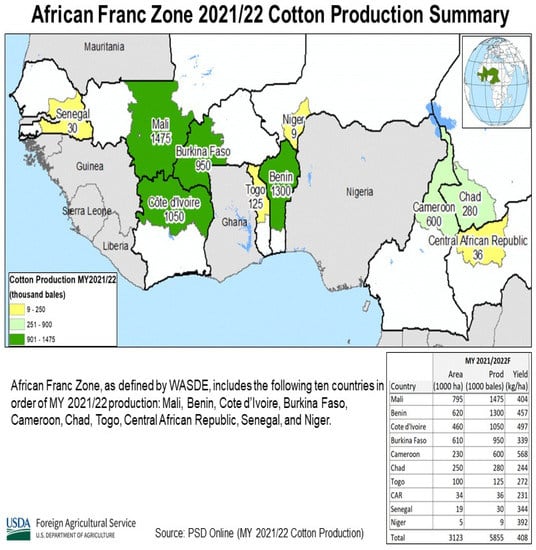 Since the 1960s, world cotton production has doubled from 10.2 to 20.3 million tons, corresponding to a likely annual increase of 1.7% []. This has garnered the cash crop as an integral part of the livelihoods of many countries, such as China. In the 2018–2019 harvest season, they became the world’s largest producer of 6 million tons, followed by India and the United States of America, with 5.8 and 4.0 million tons, respectively. Before the 1960s, cotton production in Africa was concentrated in Egypt, Tanzania, Uganda, Sudan, and Zimbabwe [,]. During the colonial regimes, the crop quickly became a source of income for over 15 African countries [], contributing to poverty reductions [,]. With the coming of the French, much of the production concentration shifted to the western tip of the continent. Today, total cotton export contributes between 25% and 45% of West Africa’s GDP []. The crop contributes between 3% and 10% of the GDP of the top four producers in Africa (Benin, Burkina- Faso, Mali, and Chad). According to [], in the 2019–2020 cotton season, Benin was the largest cotton producer in the West Africa region, but from 2021/2022, Mali (1475 thousand bales) became the largest cotton producer, followed by Benin (1300), Cote d’Ivoire (1050), and Burkina-Faso (950) [], as shown in Figure 1. Examining the volume of cotton trade (import and export operations), sub-Saharan Africa is ranked the third largest cotton producer, with 12% of the overall cotton export. Similarly, according to [], cotton is a significant contributor to Benin’s rural producers’ income.