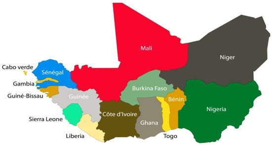 Map of Benin in the sub-region with ECOWAS members countries. Source: https://bamada.net/jeu-de-mots-et-manipulation (accessed on 4 October 2021).