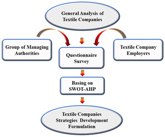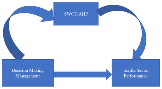 Several papers have utilized the SWOT method to evaluate organizations’ internal and external performances. For example, Ref. [] used SWOT analysis techniques and assesses the challenges threatening Pakistan’s textile and clothing industry. The method helped filter the strategic development of the Pakistan’s textile and clothing companies and government executives through an enumerative approach to the industry’s strengths, weaknesses, opportunities, and threats. A similar SWOT analysis was employed by [] to analyze Turkey’s textile industry. The authors used SWOT analysis to evaluate surveys conducted among university students, heads of school departments, alumni of these schools holding various positions in various fields of work, and the managers of the textile industry in Turkey. The result outlined several recommendations to higher education institutions on the structure and arrangement of teaching syllabus for students pursuing careers in the textile industry []. SWOT analysis has been used to conduct individual or sectorial analysis, such as evaluating the efficiency of vapor production processes for cotton-based products.
