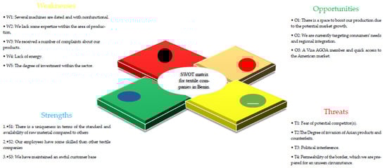 The concept of sustainable development is long known and recognized as important. According to [], the most famous definition of sustainable development is given in the 1987 Brundtland Report: “as development that meets the needs of the present without compromising the ability of future generations to meet their own needs.” Unfortunately, according to [], the concept is not always clearly defined. A variety of definitions and meanings of sustainability are possible. Sustainable production is important to efficiently use our resources and reduce waste and related costs []. Generally, according to [], there are three pillars of sustainability (social, economic, and environmental), with the famous three circles diagram illustration to have been first presented by Barbier [], albeit purposed towards developing nations. Increasingly, sustainability is being adopted as a desirable goal by policy-makers at both international and national levels. While focusing on two sustainability pillars (economic and social) for this research, we will conduct a diagnostic of these companies to understand and explore the factors influencing their development by applying the strengths, weaknesses, opportunities, and threats (SWOT) technique in combination with the analytic hierarchy process (AHP). Following a concise review of previous studies, such as [,,,,,,], our investigation underlines investment arrangements through sustainable development opportunities to increase gross domestic product. We argue that the state could justify its intervention by providing subsidies for maintaining the functionality of these production units. Furthermore, this study provides empirical evidence of the challenges highlighted, underlining the need to enhance Benin’s economic future. The findings are subjected to a rigorous review of publications and national policies. Therefore, the contribution of this current research is manifold. It will specifically assist start-up manufacturing businesses in determining which strategy companies should pursue to solve manufacturing issues. Long-established manufacturing companies may want to reconsider their existing approach in light of the finding of this study. Furthermore, government and social organizations can learn from this finding to improve their approach on how to deal with the management of the textile sector, while enhancing sustainable development.