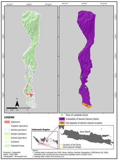 Geographical setting of Gununglurah, including land use (left) and geological condition (right).