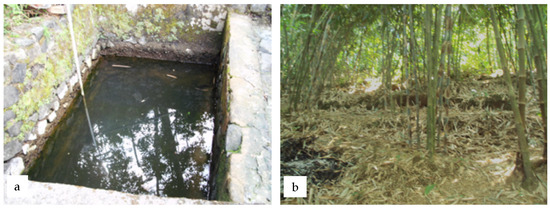 The understanding of marking (niteni), imitating (nirokke), and adding (nambahake) are used as fundamental to local wisdom establishment [56]. Based on the interview (TM-04), Banyumas people in the study area have acknowledged the cause of the landslide and marked (niteni) the signal of the landslide, particularly in the barren slope and the water leak emergence. In this study, local people have manifested these values through several simple applications. First, local people try to minimize the landslide by making the concrete pond and planting bamboos (Bambusa arundinacea) along the slope (see Figure 4a,b). Similar to Naga community in West Java, Banyumas people express the importance of bamboo or locally called pring, through arts, tools, and architecture [57]. Bamboo also represents major Javanese principles of resilience and flexibility as referred to in the following idea: “ora gampang tugel, mergo iso melur”, meaning hard to be broken due to their resilience [58].