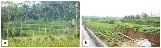 Nyabuk gunung (terracing) practice in Gununglurah including (a) for paddy field is mixed with banana and coconut, and (b) for vegetable and palawija crops (source: fieldwork April 2022).
