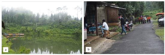 Vegetative mitigation in Gununglurah, local people also cultivate local cardamom (Amomum compactum) near the lake called Telaga Kumpe (as seen in Figure 6a). Cardamom has been noted as one of the major cash crops in the upper parts of the mountain [90]. Here, the local farmers grow cardamom surrounding the lake due to soil, temperature, and humidity. The cardamom is cultivated and harvested monthly during the beginning of the rainy season. This location is also used by local people mainly for agriculture, plantation, and tourism activities (see Figure 6b). On the other side, the vegetative mitigation exercise has been ruled strictly in most consent areas, especially sacred places such as forests, sanctuaries, and water springs. However, the infrastructure development pressure has been the main threat to this conservative action. As stated by villagers during the interview, some areas closed to the sacred places have been changed into housing and new agricultural land.