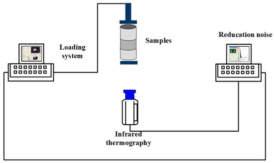 A schematic diagram of the experimental setup is shown in Figure 1. Loading the samples until rupture, the infrared thermal imager was used to observe the infrared radiation dynamics of the test surface during the loading process [43,44,45]. The collected infrared radiation information was applied to the denoising algorithm to optimize the denoising. This experiment yielded basic data and images to provide the basis of infrared radiation response mechanism in the process of bearing coal rock damage.