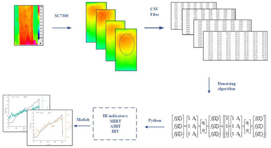 At this time, the acquired infrared data are obviously related to the emissivity. In order to obtain more accurate infrared data, the multi-band pseudo-emissivity algorithm was first used to correct the data matrix and obtain a temperature matrix unrelated to the emissivity. Python software was then applied to extract the relevant IR indicators (MIRT, AIRT and IRV). The parameters representing IRT in this area mainly include the maximum infrared radiation temperature (MIRT), the average infrared radiation temperature (AIRT) and the infrared radiation variance (IRV).