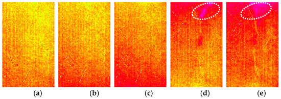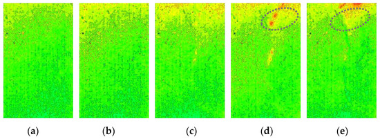 Noise reduction IRT of Sample A: (a) 102 s, (b) 200 s, (c) 576 s, (d) 800 s, (e) 963 s.