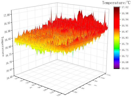 According to related studies, abnormal high-temperature areas will appear in infrared images during rock loading damage. Comparing Figure 3 and Figure 4, the change in the high-temperature area in the original infrared image is not particularly obvious because of the influence of the original emissivity of the rock. In the infrared image after noise reduction it can be observed that the abnormal high-temperature area gradually appears from the beginning of loading, and the bright band becomes increasingly obvious until it breaks. In order to further compare the difference between the infrared images before and after noise reduction, an infrared 3D cloud map was made. Figure 5 is the original infrared image cloud map at 800 s, while Figure 6 is the infrared image cloud map after noise reduction at 800 s. Comparing Figure 5 and Figure 6, it is apparent that the abnormal high-temperature area fluctuates more obviously after noise reduction.
