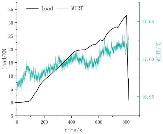 There was a correlation between MIRT and stress during the uniaxial loading of rocks. Due to the restricted sample space, only Sample A was selected for image analysis. Figure 7 shows the MIRT–load time curve without denoising, Figure 8 is the MIRT–Load time curve after algorithm noise reduction. During the loading process, the MIRT exhibits a step-by-step heating pattern as a whole over time. The rise is small, and only changes significantly at the moment of destruction. In Figure 7, the temperature increases from 16.92 °C to 17.02 °C—an increase of 0.1 °C. In Figure 8, the temperature increases from 16.98 °C to 17.03 °C—an increase of 0.05 °C. Comparing Figure 7 and Figure 8, it is clear that the fluctuation range of the MIRT data after noise reduction processing is more precise.
