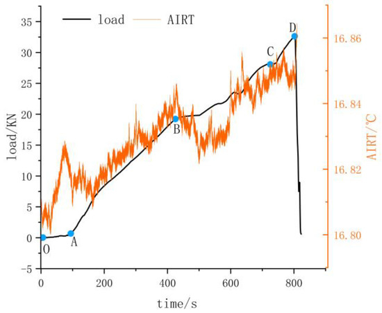 There was a correlation between AIRT and stress during the uniaxial loading of rocks. Due to the limitation of space, only Sample A was selected for image analysis. Figure 9 shows the AIRT–load time curve without denoising, and Figure 10 shows the AIRT–load time curve after algorithm noise reduction.