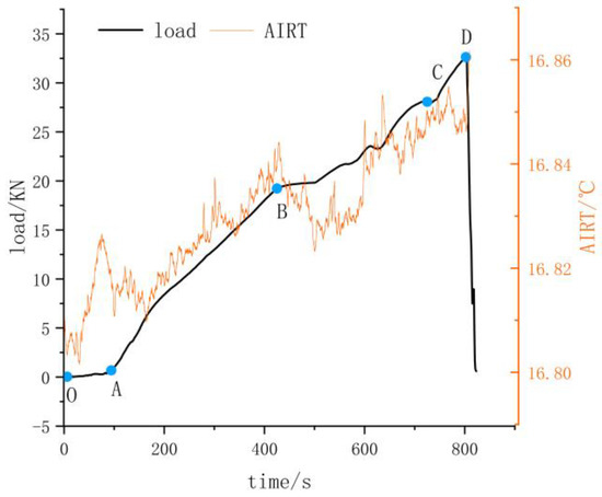 It can be seen from the figures that AIRT during the loading process was generally increasing before the damage of this specimen. At the early stage of loading (OA stage), the sample was in the pressure-dense stage, when the stress increased more slowly with time and the curve shows a concave form, at which time the AIRT gradually increased over time, and the temperature increased.