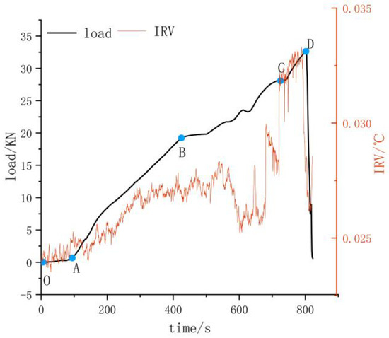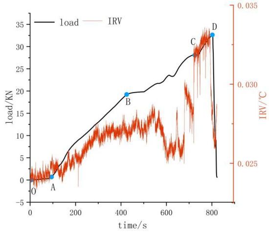 At the early stage of loading (OA stage), the sample was in the compression-density stage, when the stress increased more slowly with time and the curve shows a downward concave form, and the IRV gradually increased with time. At loading to the elastic phase (AB stage), when IRV was positively correlated with stress growth, the temperature increased under thermoelastic effects. When loading to point C (BC stage), at this point in the crack expander the IRV increase became slower and there was a small, sudden drop. In the CD section there was an increase in IRV, and when loaded to point D, the specimen underwent a significant stress drop at 789.51 s and a sudden and instantaneous change in IRV. Comparison of Figure 11 and Figure 12 shows clearly that the fluctuations of IRV data are smoother after the noise reduction process.