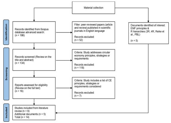 Additionally, several scientific articles included CE principles in categorizing and evaluating existing metrics at product level. To identify these, a systematic review was conducted where the Scopus database was used for material collection. An advanced search was carried out with the keywords “circular economy” and “principle, strategy or requirement” using Boolean operators (Search string: ABS (“circular economy”) AND ABS (principle OR strategy OR requirement) AND ABS (micro OR product) AND ABS (indicator OR index OR metric) AND LANGUAGE (English)) AND PUBYEAR > 2009 AND (LIMIT-TO (DOCTYPE, “ar”) OR LIMIT-TO (DOCTYPE, “re”) on 1 April 2022). Filters were applied to the Scopus database on document type and language to filter peer-reviewed papers (article and review) published in scientific journals in English. This search resulted in 134 papers. The search was followed by a screening process, performed by reading the title and abstract of every document against the inclusion criteria, which were that study addresses circular economy principles, strategies or requirements. After this filter, 16 articles were pre-selected based on relevance. The next step was going through the full text of these pre-selected papers to identify the ones that had a specific listing of the set of CE principles that they considered. This resulted in 9 articles, which were included in this review [26,27,28,29,30,31,32,33,34]. The literature review process is summarized in Figure 1.
