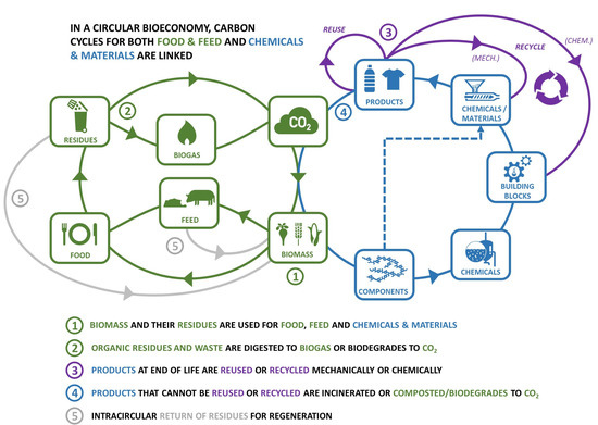 Biomass also enters the technical cycle (see Figure 6, blue cycle) and is used in the production of chemicals, plastics and materials. The biobased products can be kept in the technical cycle (see Figure 5, fourth cycle) through reuse and recycling mechanically or chemically (see Figure 6, purple lines). It is preferred to keep the cycles tighter (e.g., reuse rather than recycle) to preserve the value, which is referred to as the power of inner cycle [67]. It should also be aimed to maximize the number of consecutive cycles and/or the time spent in each cycle by extending the product life [68].