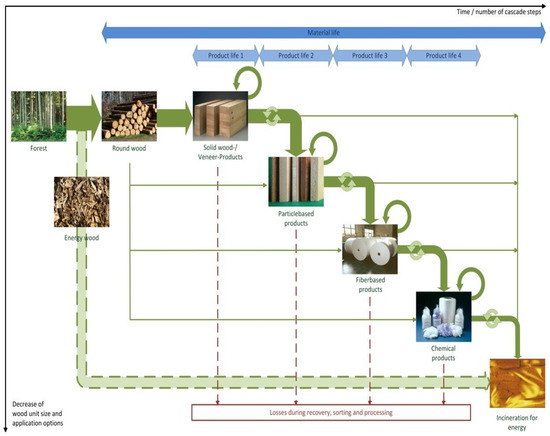 In Figure 7, this is illustrated for wood. Wood is ideally first used for construction as beams, then can be used to make particle board, paper, chemicals and energy as consecutive products while at each stage maximizing closed loop recycling before moving down to lower quality applications [82]. It will be important to design the products and recycling systems so that it will be possible to extend the high-quality use of the biomass in such a way. Cascading use can provide substantial reduction in use of virgin resources by consecutively replacing virgin material needs with each application step and allow for highly resource-efficient use of biomass [83,84]. Cascading can be observed in current practice in the flow of materials between lumber, paper and energy sectors. There is potential for cascading also in use of textiles. They can be reused multiple times (second-hand apparel) for clothing, and when no longer suitable for this original application, they can be used as fiber-fill in upholstery in the furniture industry and then for insulation in the construction industry [67,85]. Each consecutive application substitutes an inflow of virgin materials into the economy.