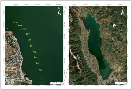 Combined with the distribution of cyanobacteria blooms in previous years, the blooms on the northern shore of Erhai Lake are relatively serious. Therefore, 100 m away from the shore, one sampling point every 120 m, and a total of 10 sampling and monitoring points were selected to form a sampling belt distributed along the coast for monitoring. The specific area is shown in Figure 1.