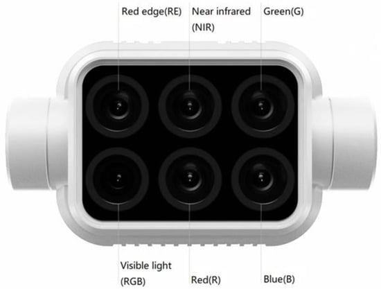 The multispectral camera carried by DJI·P4M was used for image acquisition in this experiment. The camera was equipped with six lenses, namely RGB visible light and five spectral channels of R, G, B, RE, and NIR. Parameters of multispectral camera are shown in Table 1. And this multispectral camera is shown in Figure 2.
