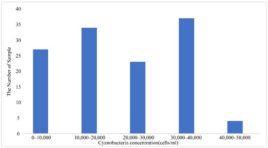 A total of 135 groups of data were collected. The measured minimum concentration of cyanobacteria was 1303 cells/mL and the maximum concentration was 45,373 cells/mL. The distribution range of all cyanobacterial concentrations is shown in Figure 3.