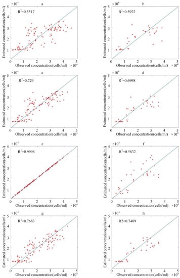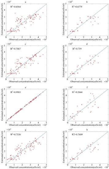 The model dataset was randomly divided into a training set and test set at a ratio of 3:1, and the independent variable of the model was the gray value of images in different bands. As the image was in TIF format, it was a 16-bit grayscale image with a grayscale value range of 0–65,535. The unit of the input independent variable is cells/mL, and the magnitude was also large, so they are normalized, put into the model for analysis, and then inverse normalization is carried out after the results are output.
