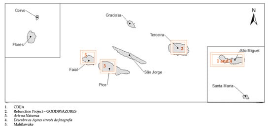 The study comprises five pilot projects of creative tourism operating in the Azores Archipelago, Portugal. The pilot projects analyzed were: (i) CDIJA (The acronym CDIJA means Azores Child and Youth Development Center; in Portuguese: Centro de Desenvolvimento Infanto-Juvenil dos Açores); (ii) Refunction Project—GOODBYAZORES; (iii) Art in Nature (Arte na Natureza)(The original name (in Portuguese) of the project Art in Nature is Arte na Natureza); (iv) Discover the Azores through Photography (Descubra os Açores através da fotografia)(The original name (in Portuguese) of the project Discover the Azores through photography is Descubra os Açores através da fotografía); and (v) Mahilawake. In terms of the archipelago (Figure 2), these pilots are located on four of the nine islands. Two of them are on the most populated Island (São Miguel)—namely CDIJA and Art in Nature projects, one on the Terceira Island (Refunction Project—GOODBYAZORES), and another one on Faial Island (Mahilawake).