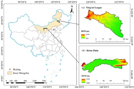 Study area overview map. The location of Inner Mongolia Autonomous Region of China, the study area in Inner Mongolia with two agroecological zones (Xing’an League (a) and Hetao Plain (b)).