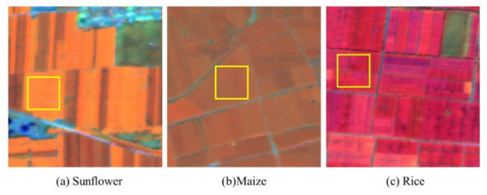 Crop characteristics on false color synthesis Sentinel-2 images (band8, band11, and band4, the stretch type is standard deviations). We use small tiles of 256 × 256 pixels, and the size of the yellow box is 64 × 64.