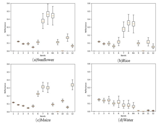 To reduce the labeling cost, the sketched samples are polygon vectors, inconsistent with the pixel-level samples required by the model. Thus, in this study, the ROI and the image corresponded one by one through the sample vector polygon and the geographic coordinates of the image. The ray method [28] was adopted to judge whether the pixel is in the vector polygon; if so, the value of each band of the pixel and the corresponding sample label value were recorded. Since there may be mixed pixels in remote sensing images, quartile box plots (Figure 4) were drawn in this study for three crops (maize, rice, sunflower) and water bodies to ensure the purity of the samples.