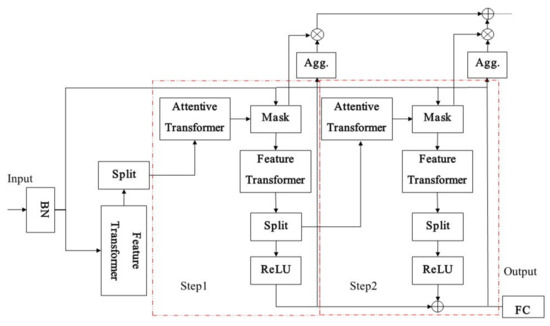 Tabnet was originally used to classify tabular data [30]. Based on the performance of decision trees, the network constructed a process with a hyperplane decision manifold similar to decision trees by determining the feature contribution coefficients in the decision-making process. Compared with conventional methods based on Deep Neural Networks (DNN), Tabnet has powerful soft feature selection capabilities in addition to controlling sparsity through sequential attention. For instance, in hyperspectral remote sensing crop classification, Tabnet considers multiple spectral features instead of only focusing on several important red-edge band features. Tabnet’s soft feature selection mechanism can avoid complex problems (e.g., “same substance, different spectrum, same spectrum foreign matter”) to a certain extent. The basic encoder structure of Tabnet is presented in Figure 5: