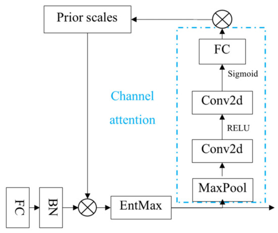 The improvement in this study is mainly to add channel attention to the Attentive transformer module (Figure 6). After the EntMax module, a channel attention module composed of a Maximum Pooling layer (MaxPool), a convolutional layer (Conv2d), and a Fully Connected layer (FC) was added respectively. Where the first convolution is used for channel compression, and the second convolution expanded the channel to input channel C. The sigmoid function was used to map the weights of the C channels between 0 and 1. The channel attention feature map was obtained after multiplying the input feature map with the weights. Lastly, the FC layer generates channel attention feature maps, which were used as input to prior scales to update the abstract features generated by the FC and BN layers within the Attentive transformer. The addition of channel attention reduces the limitations of local perception of convolutional neural networks to a certain extent. Extending single channel to multi-channel optimizes feature extraction and facilitates the improvement of model efficiency and accuracy, which is suitable for hyperspectral remote sensing crop extraction with complex spectral features.