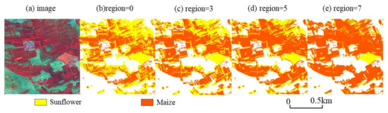 The test results showed a considerable number of broken spots before the neighborhood information was added. When the neighborhood size was set to 3 × 3 pixels, the salt and pepper phenomenon was improved, whereas the boundary was still not significant. When the neighborhood size was set to 7 × 7 pixels, numerous sunflowers were mistakenly detected as maize, and the field boundary also showed a corrosion phenomenon. Only when the neighborhood size was 5 × 5 pixels, the sunflowers and maize were accurately distinguished, and the boundary information was effectively extracted.
