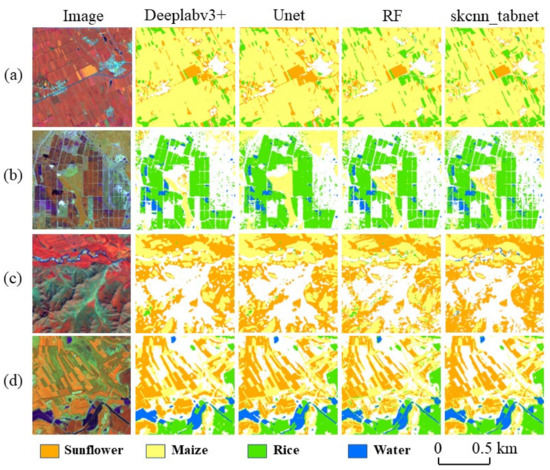 Deeplabv3+ optimizes the segmentation effect of objects of different scales by introducing ASPP convolution. However, the overall accuracy is low due to the low classification accuracy of sunflower and other categories. UNet retains more detailed information by fusing context information. Both the single-class accuracy and the overall accuracy of crop recognition have been increased to a certain extent. The accuracy scores of the classification results of Skcnn_Tabnet suggest that the soft feature selection mechanism and channel attention of the Skcnn_Tabnet network can significantly increase the accuracy of crop remote sensing classification results. The overall accuracy of these classification results reaches 0.9270, which is 0.1121, 0.1004, and 0.0874 higher than Deeplabv3+, UNet, and RF methods, respectively. For the single class, the average IoU and F1 Scores of Skcnn_Tabnet for five types of ground objects are 0.1818 and 0.1103 higher than Deeplabv3+, and 0.1543 and 0.0895 higher than UNet. The above analyses reveal that the Skcnn_Tabnet network is highly promising in the field of crop remote sensing classification.