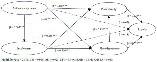 We set the standard as Bootstrap’s sample size of 5000, with a confidence interval of 95%, to test the mediating effect of place identity and place dependence. The results (as shown in Table 5) reveal the mediating effect values of “authentic experience → place identity → loyalty” and “authentic experience → place dependence → loyalty” are β = 0.044 (p < 0.05) and β = 0.053 (p < 0.05). The mediating effect values of “involvement → place identity → loyalty” and “involvement → place dependence → loyalty” were β = 0.062 (p < 0.05) and β = 0.148, (p < 0.05), respectively. In addition, the direct effect of the authentic experience and involvement on the degree of loyalty is not significant, and it is concluded that place dependence and place identity play a complete-mediating role in the relationship between authentic experience and involvement in loyalty. Hypotheses 5, 6, 10, and 11 are thereby supported.