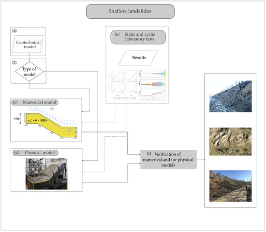 Flowchart of shallow landslide examination process: (a) geotechnical model input, (b) type of model decision, (c) numerical model, (d) physical model, (e) static and cyclic laboratory results, and (f) verification of numerical and/or physical models.