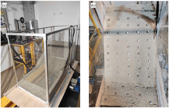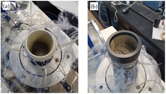 Ladd’s undercompaction method [69] was used for sandy specimen preparation. The method ensures uniform density within a soil specimen. The method is known as a moist tamping method and can cause relatively small grain crushing [70,71,72]. The method was used to achieve the previously selected relative density of 50% for small-scale slope material testing under dynamic loading. A corresponding void ratio was calculated based on the minimum and maximum void ratio defined in Table 3 and initial relative density of 50%. An example of two stages of specimen preparation are presented in Figure 6. Figure 6a presents a lower layer of compaction, while Figure 6b presents an upper layer of compaction. Layers are compacted using a compactor, as suggested by [73].