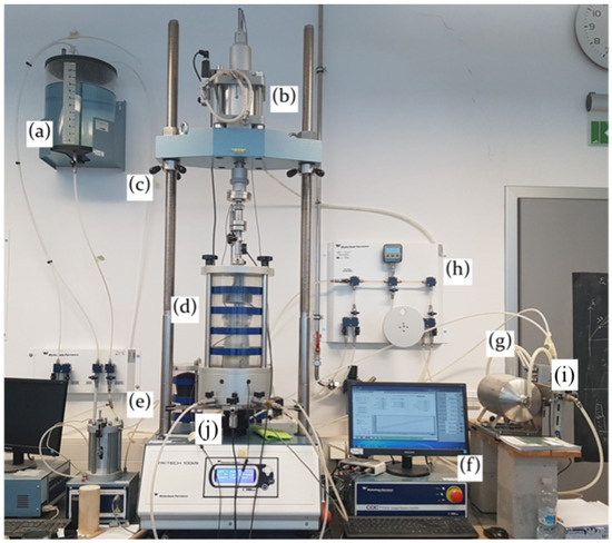Cyclic tests were conducted on a Dynatriax triaxial system manufactured by Controls Group Ltd., Milan, Italy [67]. The Dynatriax system (Figure 4) is a closed-loop triaxial system with the capability of performing dynamic cyclic triaxial tests in both drained and undrained conditions. The maximum cell pressure that can be applied to the soil samples is 1 MPa. The actuator (Figure 4b) has a frequency of 10 Hz and a maximum dynamic capacity of 15 kN, and it is controlled by the control unit with pneumatic air (Figure 4g). The system has two linearly variable differential transducers (LVDTs) that are used for measuring vertical displacement; one is outside the triaxial cell, and the other is within the pneumatic actuator. A submerged load cell (Figure 4d) with a capacity of 25 kN is used to measure a load on the sample. Cell pressure and back pressure are measured using the pressure transducers located on the pneumatic control system (Figure 4i), while the pore pressure is measured using a pressure transducer connected to the lower part of the triaxial cell (Figure 4j). All transducers are aligned vertically.