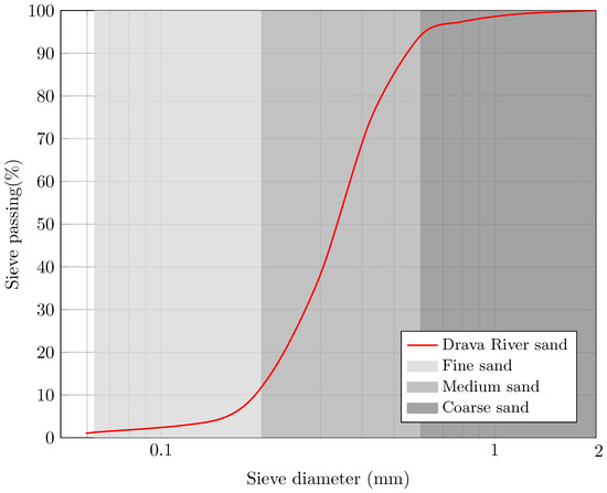 Uniform, clear sand (0.1 to 1.0 mm), known as Drava sand, was used in this study [23]. Sand was classified according to ISO standards [68] based on sieve analysis, index density tests, and specific gravity tests. Table 3 summarizes the key parameters, while the grain size distribution curve is presented in Figure 5. Table 4 summarizes the mechanical properties of the sand.