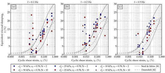 In the following subsection, the results of an undrained triaxial tests are presented and compared with the ones from literature. First, the equivalent viscous damping is plotted against the cyclic shear strain as discrete points. This damping ratio of sand obtained at low confining stresses with varying loading frequency is presented in Figure 8. Blue marks are discrete points from the 2nd cycle, while red ones are for the 10th cycle. The obtained results of damping are compared with those from the literature, e.g. Seed and Idriss [80] and Darendeli [81].
