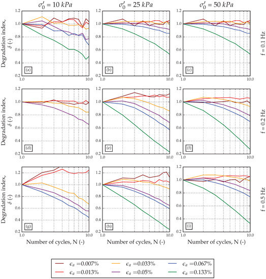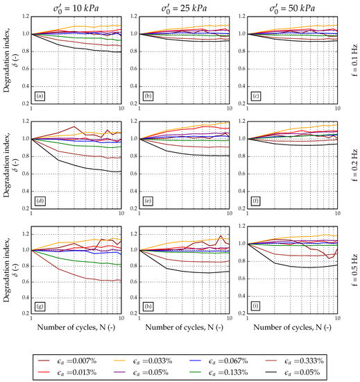 Degradation index related to number of cycles: (a) 0.1 Hz loading frequency at confining stress of 10 kPa, (b) 0.1 Hz loading frequency at confining stress of 25 kPa, (c) 0.1 Hz loading frequency at confining stress of 50 kPa, (d) 0.2 Hz loading frequency at confining stress of 10 kPa, (e) 0.2 Hz loading frequency at confining stress of 25 kPa, (f) 0.2 Hz loading frequency at confining stress of 50 kPa, (g) 0.5 Hz loading frequency at confining stress of 10 kPa, (h) 0.5 Hz loading frequency at confining stress of 25 kPa, and (i) 0.5 Hz loading frequency at confining stress of 50 kPa.