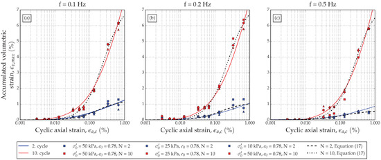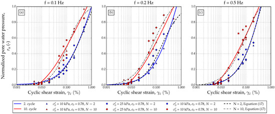 The values of normalized pore water pressure, , at cycles N = 2 and N = 10 are plotted as discrete points with respect to cyclic shear strain amplitude, , in Figure 11. Discrete points are fitted with a simple logarithmic function using Python computer software [83] and the SciPy module [84]. The nonlinear least squares method was used to obtain the best-fit parameters [84,85] and to formulate the equation representing pore water pressure build-up as a function of frequency and cyclic shear strain. Equations (15) and (16) present such a model for cycles N = 2 and N = 10, respectively: