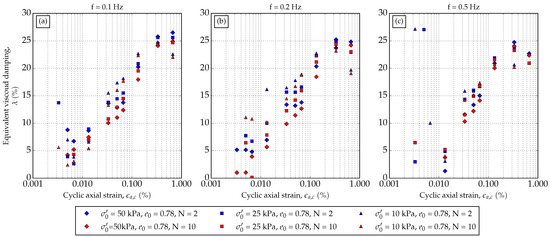 Equivalent viscous damping ratio related to relative axial strain determinated in drained tests: (a) 0.1 Hz loading frequency, (b) 0.2 Hz loading frequency, and (c) 0.5 Hz loading frequency.