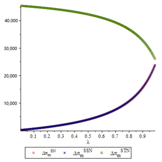 Proposition 5 indicates that the government subsidy improves the payoff of the poor farmer, the profit of the firm, and the whole supply chain. On the other hand, the subsidy leads to the decrease in the payoff of the regular farmer, but the total payoff increase of the poor farmer is more than the total payoff decrease of the regular farmer. Generally, government subsidy is beneficial to the whole supply chain and the social welfare. Given , and From Equations (11)–(14), (16), (25)–(28), and (31), we find that the mathematical formulas above are very complex. To provide a direct view for the reader, we use Maple 13 to simulate the mathematical formulas with the . Give and substitute with We have Figure 2 as follows.