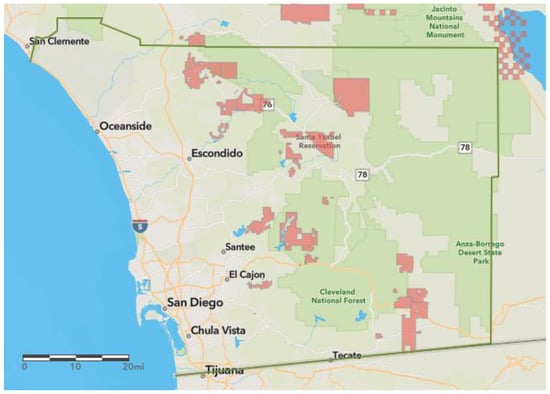 Map of San Diego County, the Federal American Indian Reservation (Orange) and Off-Reservation Trust Lands (Green). (Source: US Census Bureau and the National Tribal Geographic Information Support Center (tribalgis.maps.arcgis.com (accessed on 1 August 2021))).