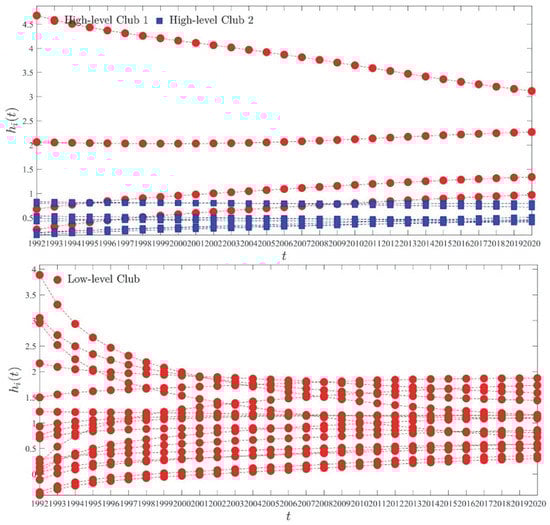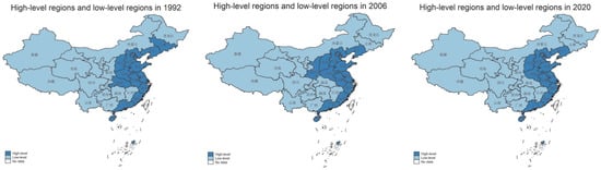 The geographic distribution of the high-level regions in Figure 2 shows that they had gradually shrunk from the eastern and the central regions to the eastern regions while the economic advantage of the northeastern region had gradually disappeared. At the beginning of the time series, the high-level regions included 10 eastern regions (Beijing, Tianjin, Hebei, Shandong, Jiangsu, Shanghai, Zhejiang, Fujian, Guangdong, and Hainan), 4 central regions (Shanxi, Henan, Anhui, and Hubei), and 2 northeastern regions (Jilin and Lining). In 2006, Hubei and Jilin became low-level and Liaoning remained the only high-level region among the three northeastern regions while Shaanxi developed into a high-level region. In 2020, Shaanxi returned to being a low-level region, thus forming a high-level regional group dominated by eastern coastal regions and a small number of central regions, whereas a low-level group was dominated by the central, western, and two northeastern regions. The economic growth of most regions showed positive spatial correlations from 1992 to 2020, with geographically adjacent high- and low-level regions being clustered and distributed, respectively. Therefore, spatial club convergences between both these regions are highly likely.