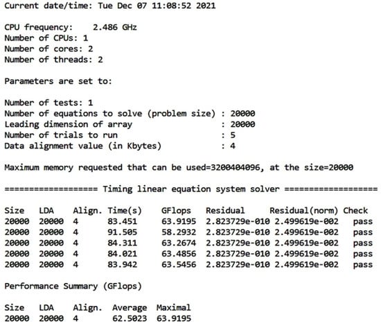 This work uses the Linpack Xtreme program released on Windows 10, 8, 7 (32 bit and 64 bit), version v1.1.5 of 31 December 2020 [39]. Linpack Xtreme is a console front-end developed by Intel with the Intel Math Kernel Library Benchmarks (2018.3.011) build of Linpack. Linpack Xtreme requires and generates the parameters shown in Table 1, and can be executed to solve: