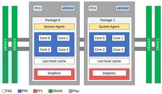 The RAPL interface provides this information through control register-counters (MSR, model-specific register) accessible from the instruction set included in the architecture specifically for debugging, program execution tracing, computer performance monitoring, and toggling/altering certain CPU features. Moreover, it considers different energy consumption zones or domains (Figure 5). Both monitoring and limiting energy consumption can be independently executed from each of the domains. These domains are the following [44]: