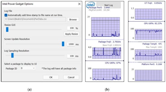 Intel Power Gadget tool: (a) input options and (b) graphic results.