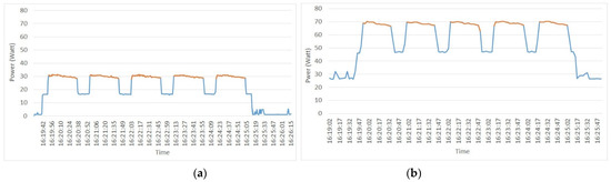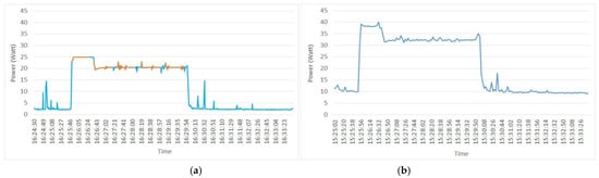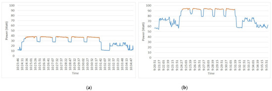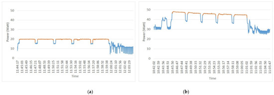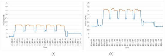 SUT5 power (Watts) versus time (h:m:s) (a) Power Gadget power measures and (b) oZm power measures.
