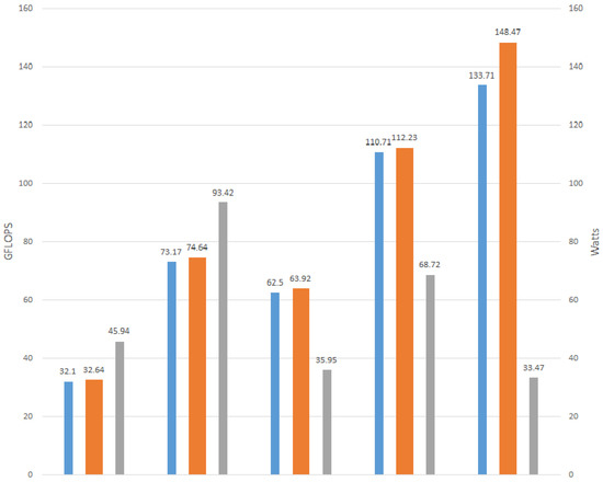 For the energy efficiency measurements of the systems under test in this work, similarly to Green500, we use the value generated with the Linpack runs as Rmax and the average power of all the electrical supply delivery to operate the computer system. That is, of the one obtained by oZm. Figure 12 and Figure 13 show the previous results in bar charts. As it can be seen, the most recent generations of equipment show a higher performance rate.