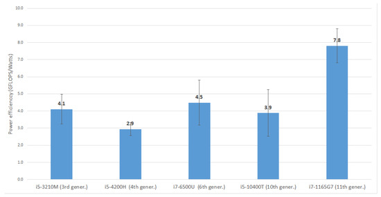 One data source available from Intel Power Gadget is the power of the processor (CPU) (see Table 6), which can be combined with the performance ratios of execution (Ravr and Rmax) obtained with Linpack. This is shown in Figure 14. It is also possible to obtain the energy efficiency of the specific domain of the isolated processors (UC + ALU + FPU + GT + other circuits on the microprocessor chip), as detailed in Table 12 and represented in Figure 15, where bars are included to depict the variability of the results. It is recalled that the standard deviation is a measure of the amount of variation or dispersion of a set of values and, in the present case, these deviations correspond to the fact that not all the machine instructions of a processor consume the same energy, and to the out-of-order execution, cache hits, and other run-time optimizations. These tests have been executed in multitask OS (Windows), so the CPU have to spend some time in another small processes, internal Kernel activities or attending network packets, so that during the execution of a program the values can spread over a wide range around the mean. In Figure 7, Figure 8, Figure 9, Figure 10, Figure 11, it is possible to observe both the power variations in the successive core phases and in the idle phases (baseline), which determine the value of the standard deviation. Even from Figure 11, it can be seen how the first run of Linpack contains at the beginning instructions different from the other four, probably to initialize the parameters and data of the program. All these variations are mathematically represented by the standard deviation, being greater as the fluctuations between the energy consumed by the instructions increase.